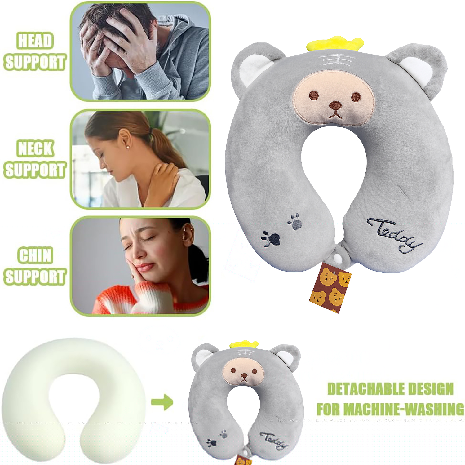 Descubre la comodidad incomparable de la almohada cervical viscoelástica “Teddy”, diseñada para que cada viaje sea más cómodo y alegre para tu pequeño.