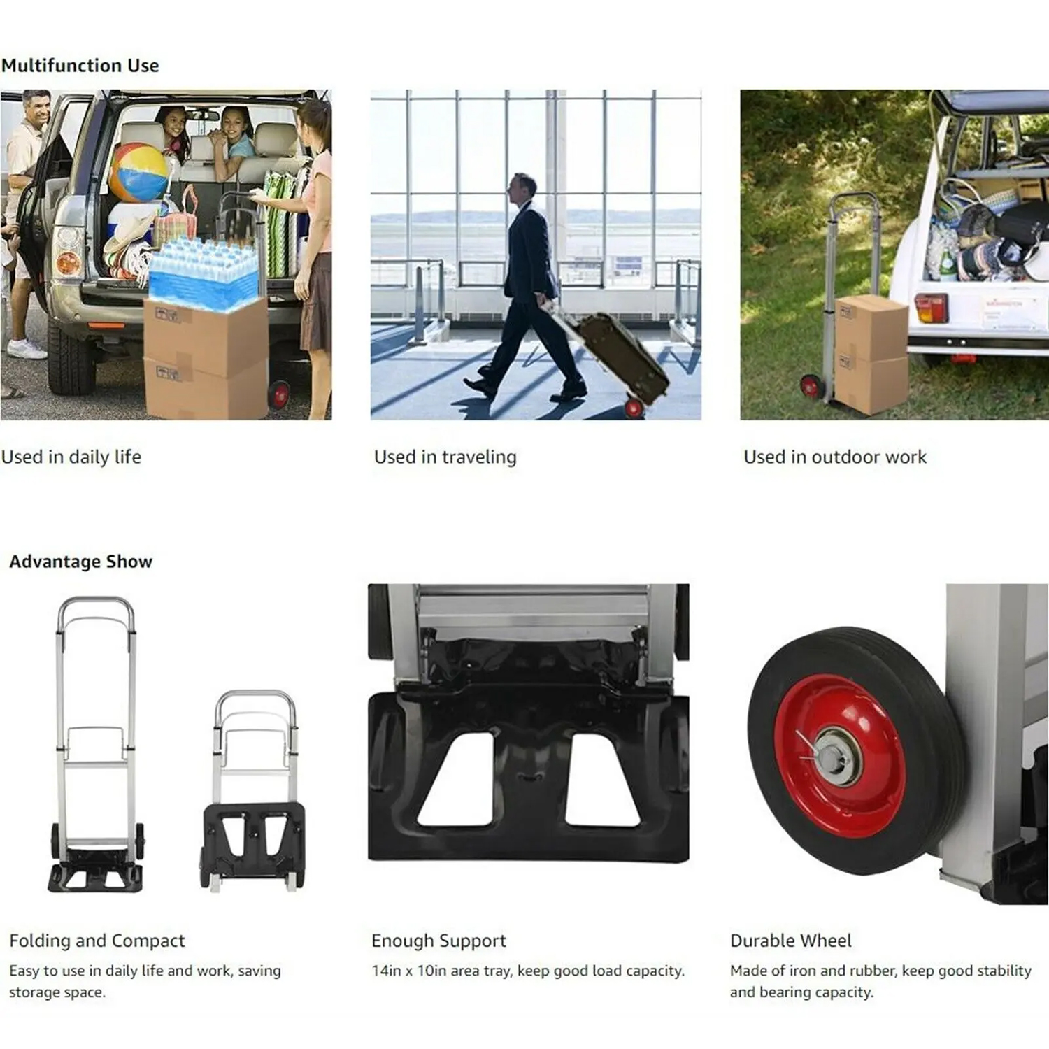 Es muy compacto y fácil de llevar y almacenar. Los artículos grandes y pesados se pueden transportar ajustando el mango, muy conveniente de usar en la vida diaria y el trabajo.