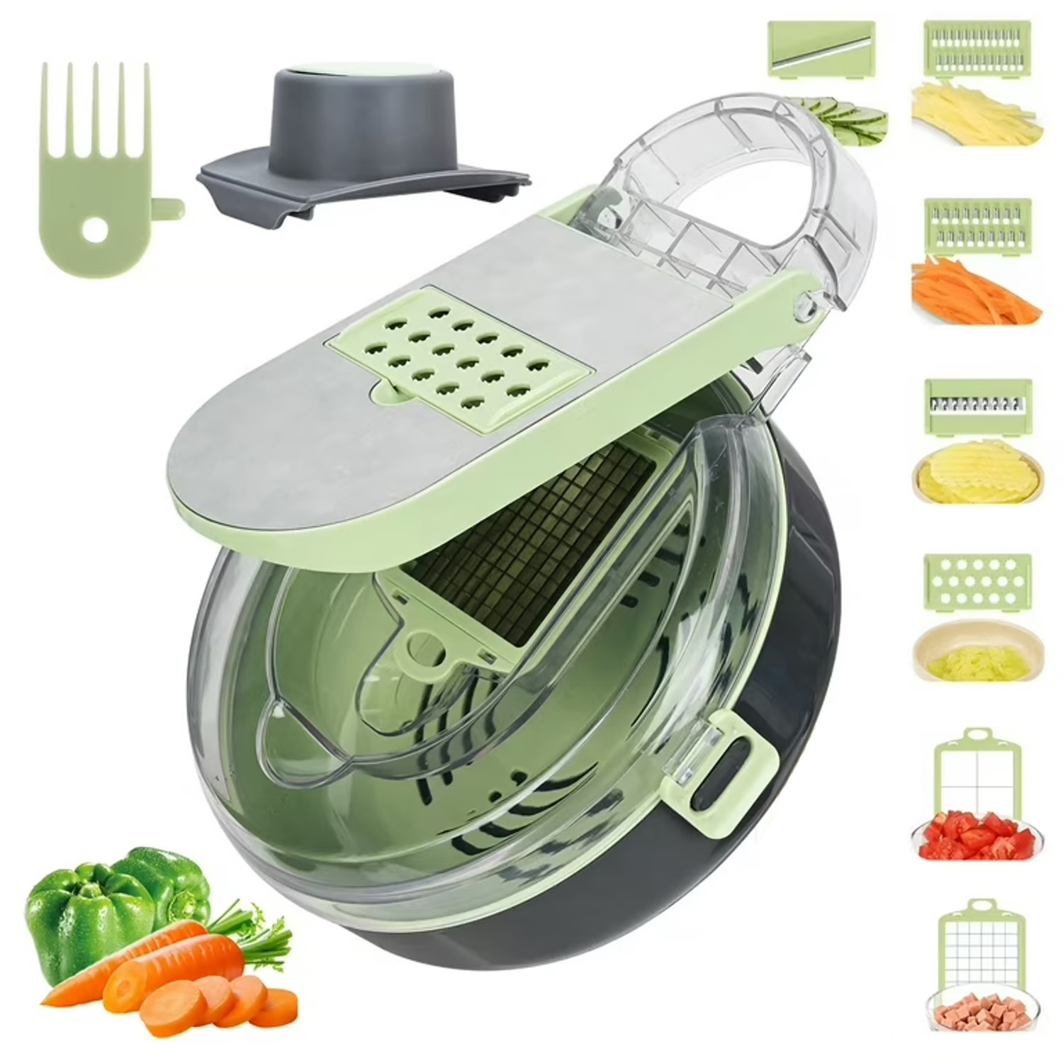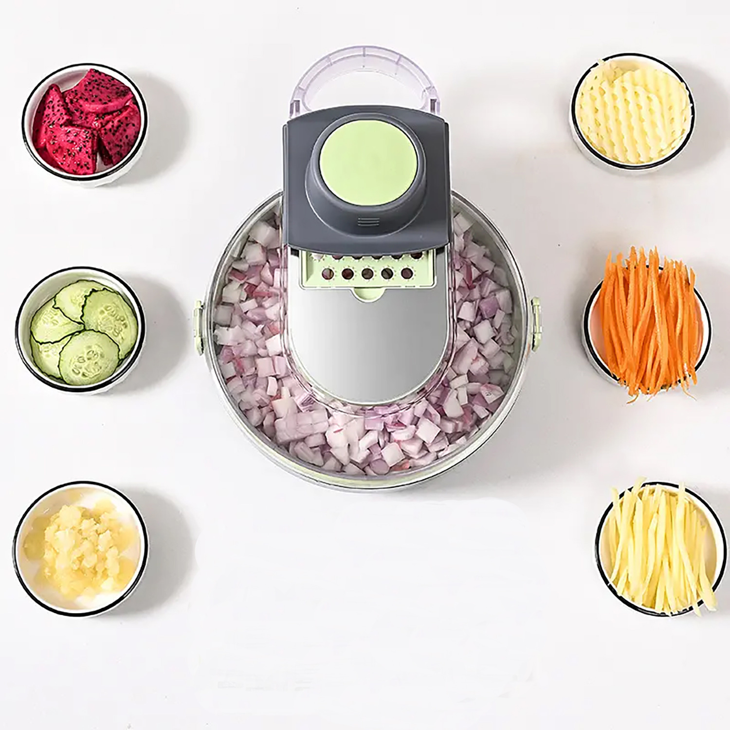 Este cortador de verduras multifuncional incluye 8 cuchillas ultrafiladas y un sistema de drenaje integrado, permitiéndote picar, rallar y cortar de forma rápida, segura y sin ensuciar.