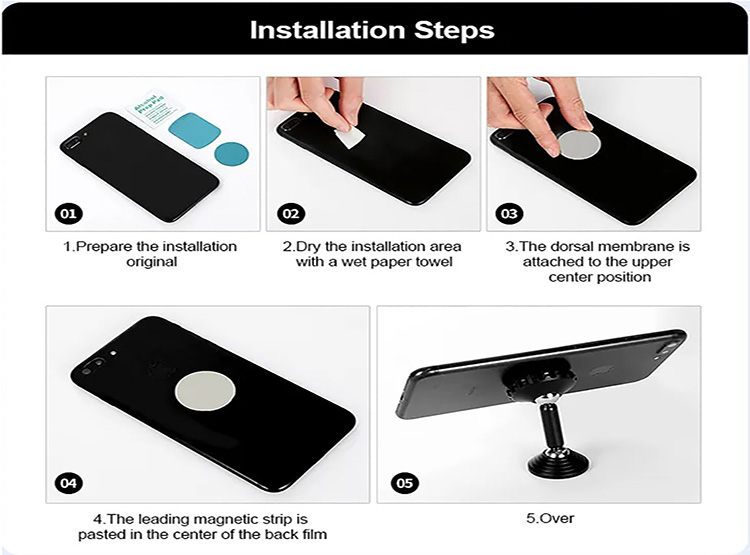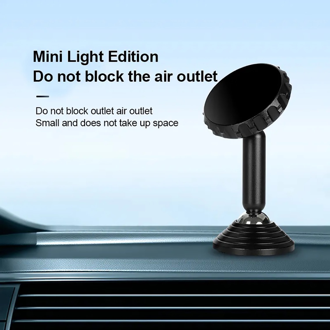 Soporte de fácil instalación con potentes imanes que fijan el celular con seguridad; se coloca en cualquier parte del tablero y permite rotación de 360° para mejor visibilidad y ajuste.