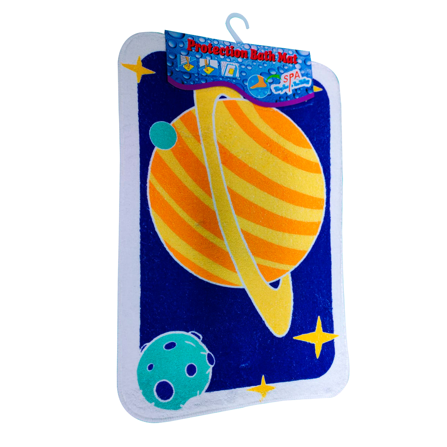 Su superficie suave y absorbente mantiene tus pies secos después del baño, mientras su base antideslizante brinda firmeza y evita resbalones. El diseño presenta el planeta saturno con expresión encantadora sobre un fondo azul, ideal para llenar de alegría cualquier rincón de tu hogar.