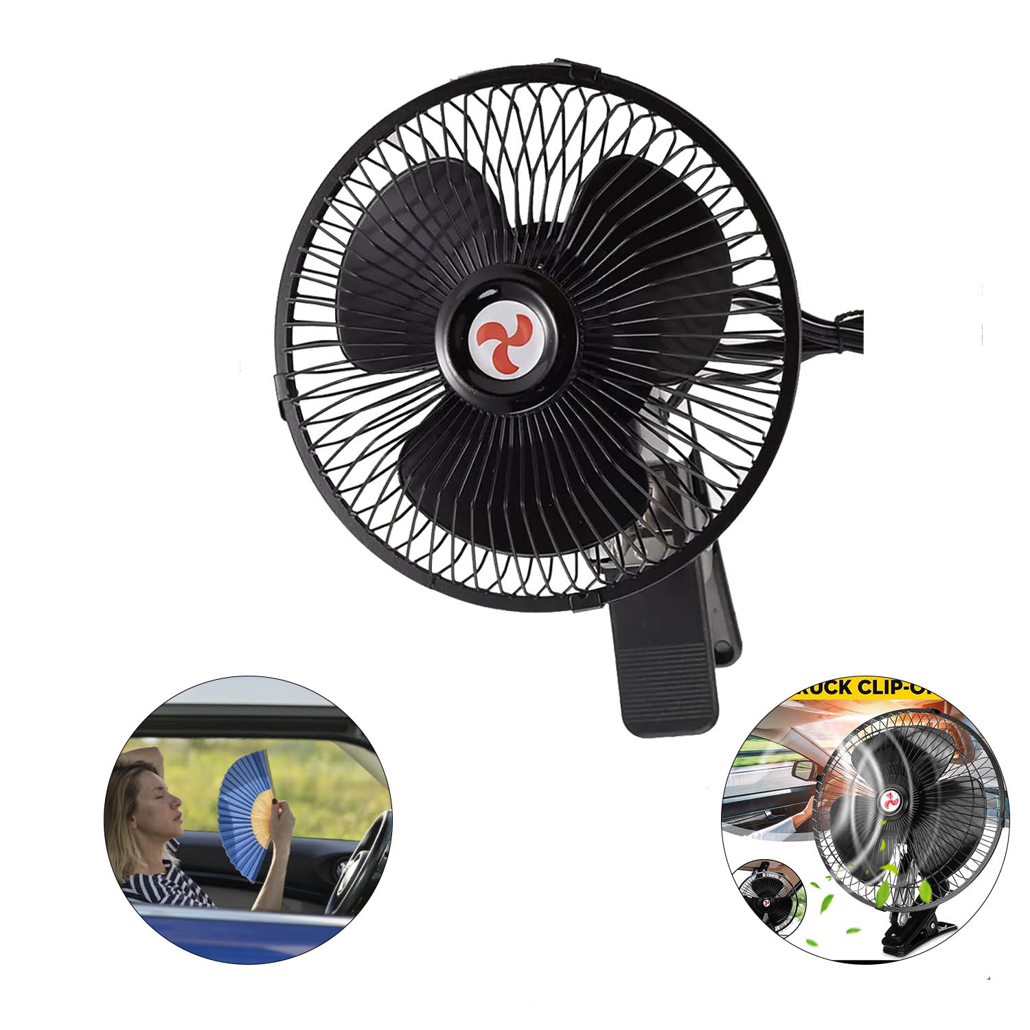 Ventilador oscilante para auto de 8″ (20 W), hecho de ABS y metal, con giro de 360°, inclinación de 180°, dos velocidades, clip de fijación para visera o manijas, conexión al encendedor del vehículo y cable de 14 cm, ideal para refrescar el coche, camión o vehículo todoterreno.
